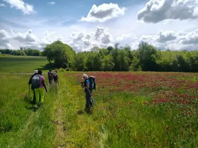 Apres un repas et une pause bien mérités, nous repartons sous la houlette de Jean-Francois qui pour nous éviter les chemins boueux nous fait prendre des chemins de traverse. Malgré toute sa bonne volonté nous avons malheureusement dû patauger dans quelques passages, ce qui n’a fait qu’augmenter la bonne humeur du groupe.